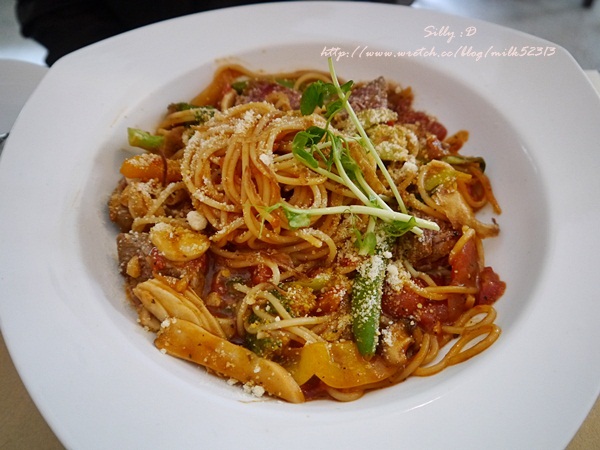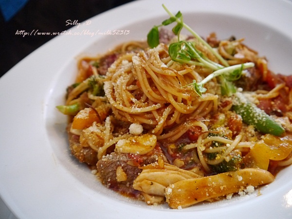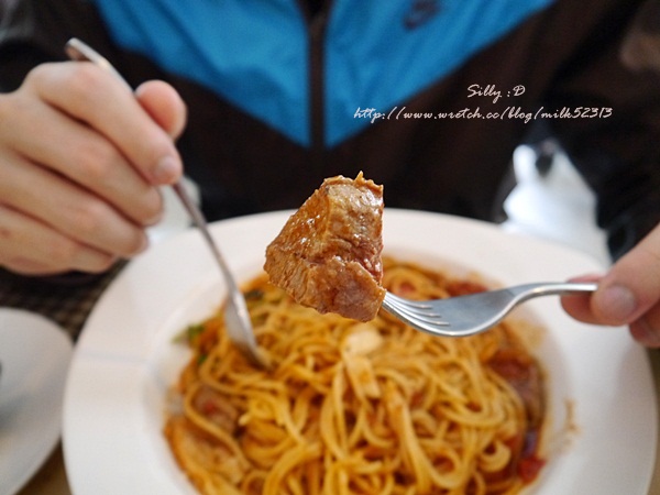 看著菲力牛排一塊塊躺在紅酒色的義大利麵中