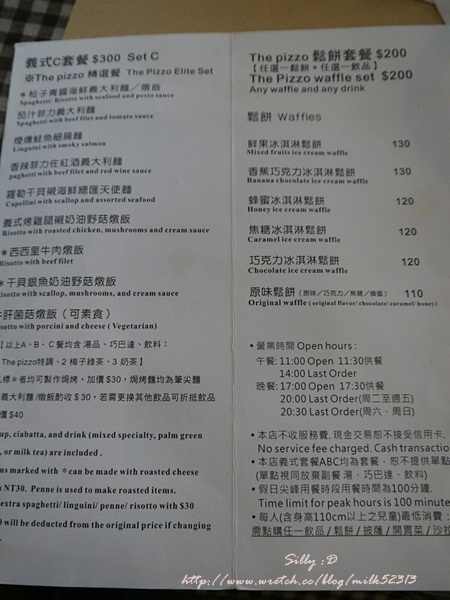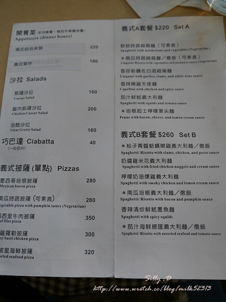 有開胃菜、沙拉、巧巴達、PIZZA(單點)、義式套餐(無提供單點)、鬆餅(單點or套餐)