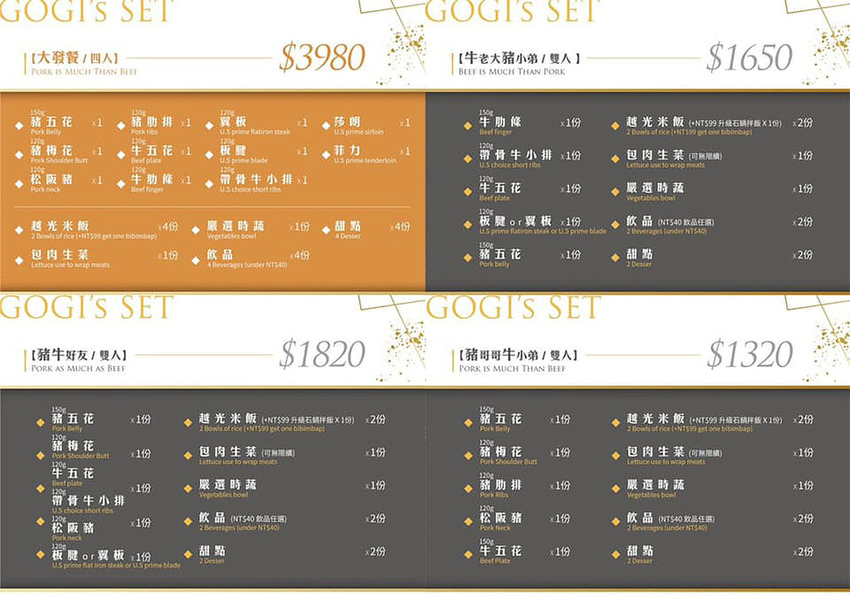 GOGI GOGI提供4款燒肉套餐,雙人套餐有 偏豬的豬哥哥牛小弟、偏牛的牛老大豬小弟、
