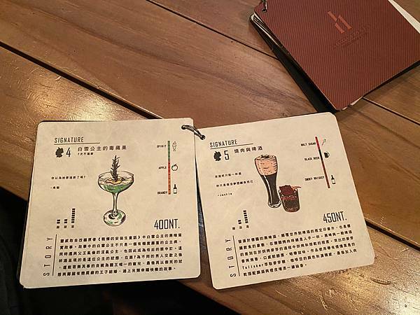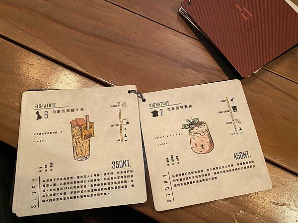 酒單有兩本基本款及創意調酒,很特別的是酒單都是手繪的~每一杯調酒都畫得很精緻美麗,介紹的也很詳細哦包括濃烈度或是風味等。讓客人更好選擇自己的喜好!