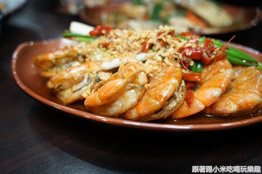香辣白蝦(220元)有蒜香帶辣,而且辣勁挺強的,店家貼心的將蝦子稍微剖開讓大家方便實用,擺盤上也不是像一般快炒店用美耐皿盤,以餐廳等級的精緻,卻是快炒店平價的價位,真的很推薦