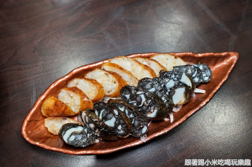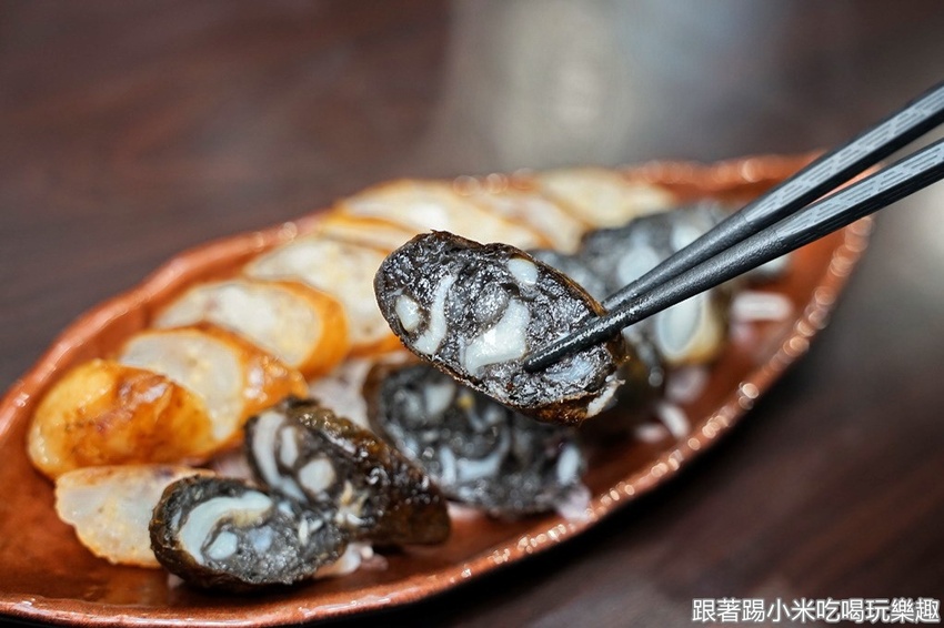 烤雙色香腸(160元)是墨魚跟飛魚卵不同口味的香腸組合,烤香腸的火侯控制的不錯,外皮烤得有點帶酥的口感。