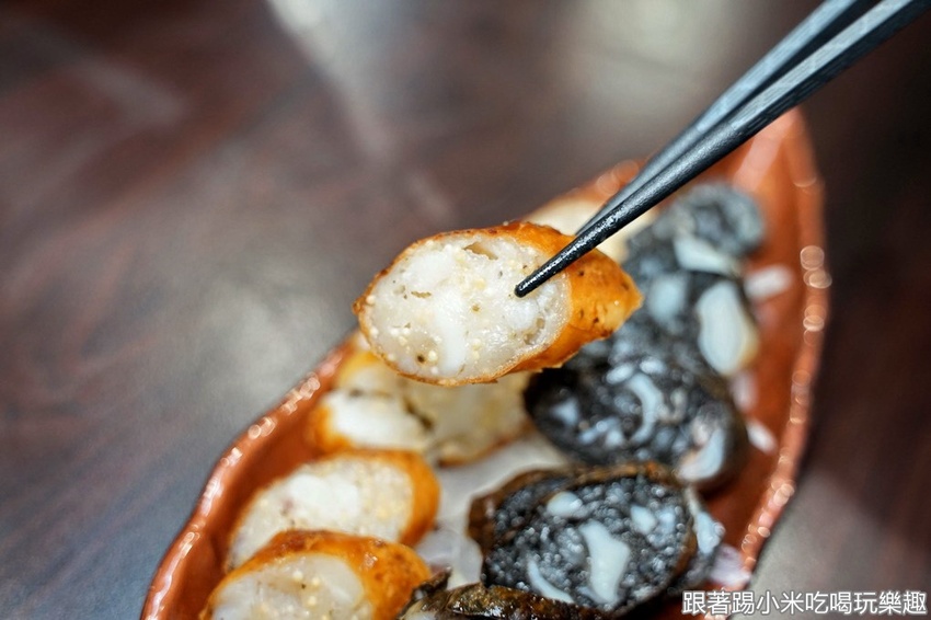 墨魚香腸裡面的墨魚肉還挺多的,彈牙還有豬肉的甜味還不錯。