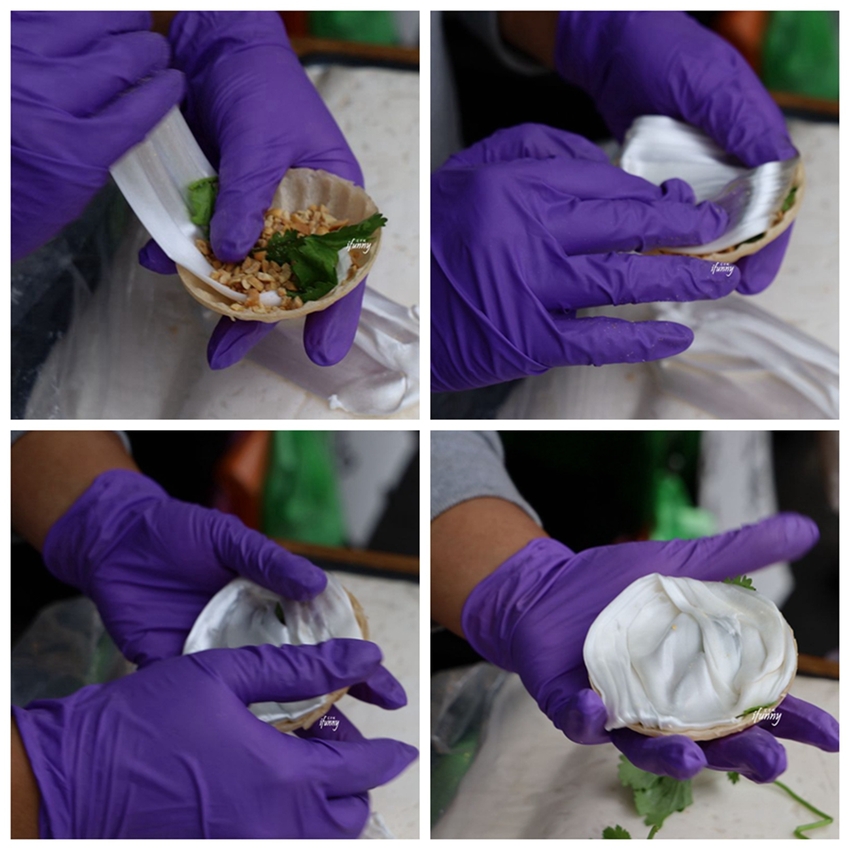 接著再利用麥芽糖把香菜及花生碎包覆在其中。