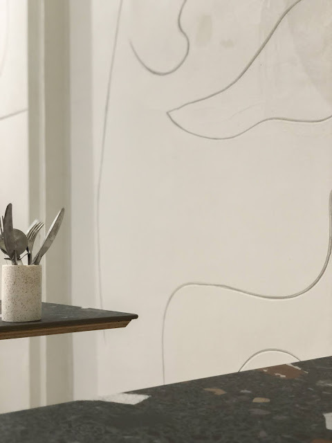 牆壁以白底為主,搭配自由奔放的深灰線條,