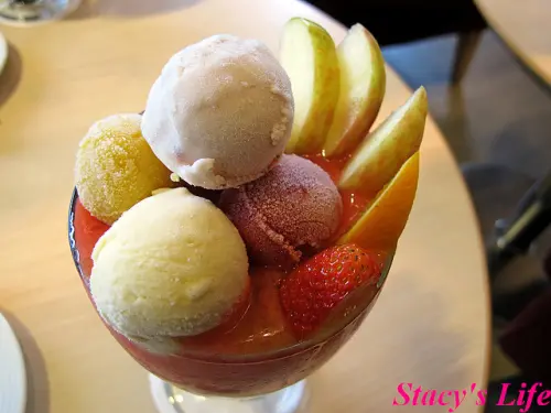 桑果之吻 (325元),整杯夏日飲品非常的繽紛,冰淇淋、水果及漸層的飲品看似火熱吃起來卻透涼沁心。仲夏野莓、草莓、芒果百香果冰淇淋吃起來有酸有甜,底下的冰沙是覆盆子及芒果雪酪,開始還以為是葡萄柚,吃起來甜中帶點微苦,底下的芒果雪酪嚐起來較甜,但兩者並不搶了互相的風采,相較起來上頭擺的水果反而相形失色啦!