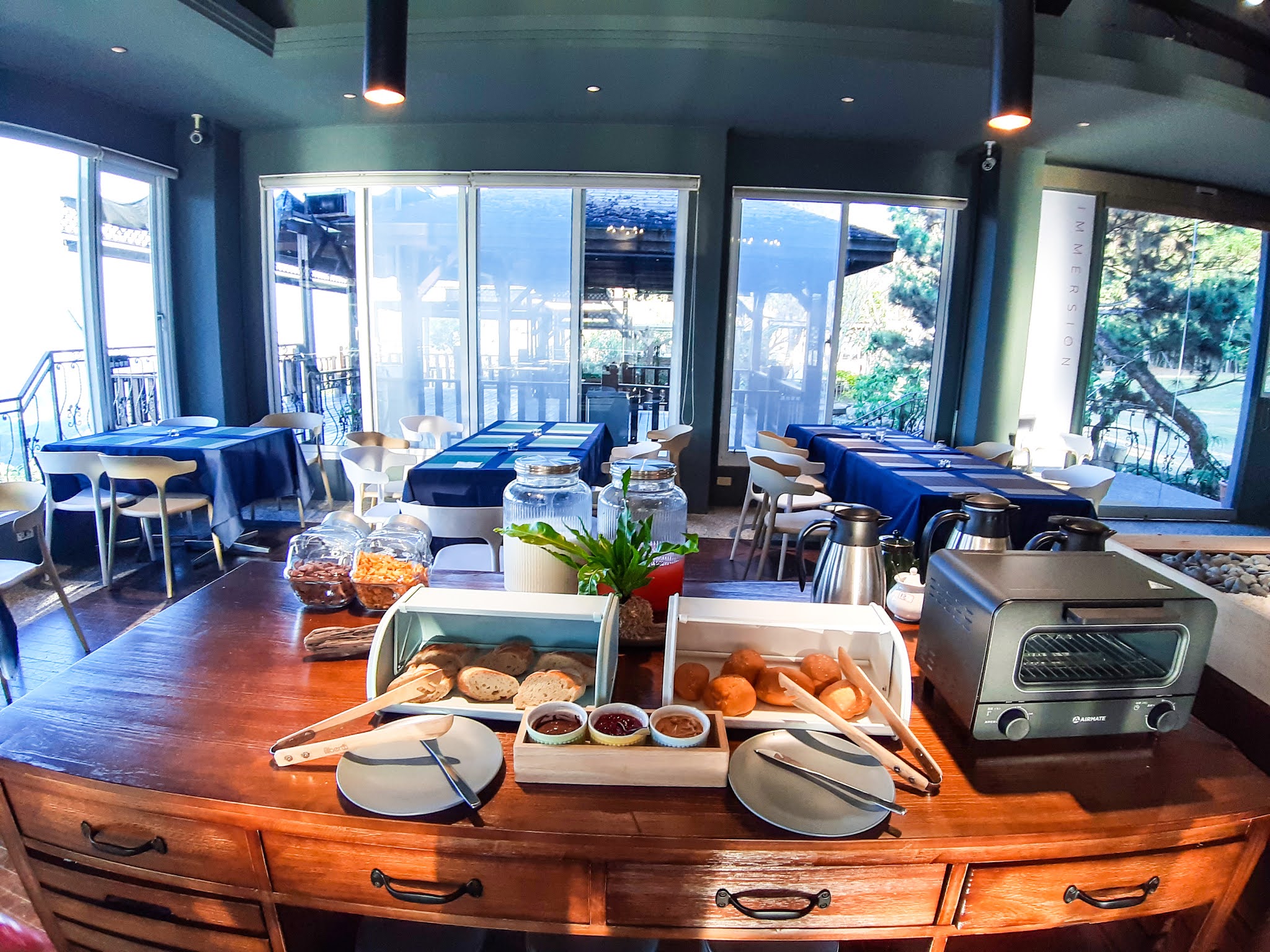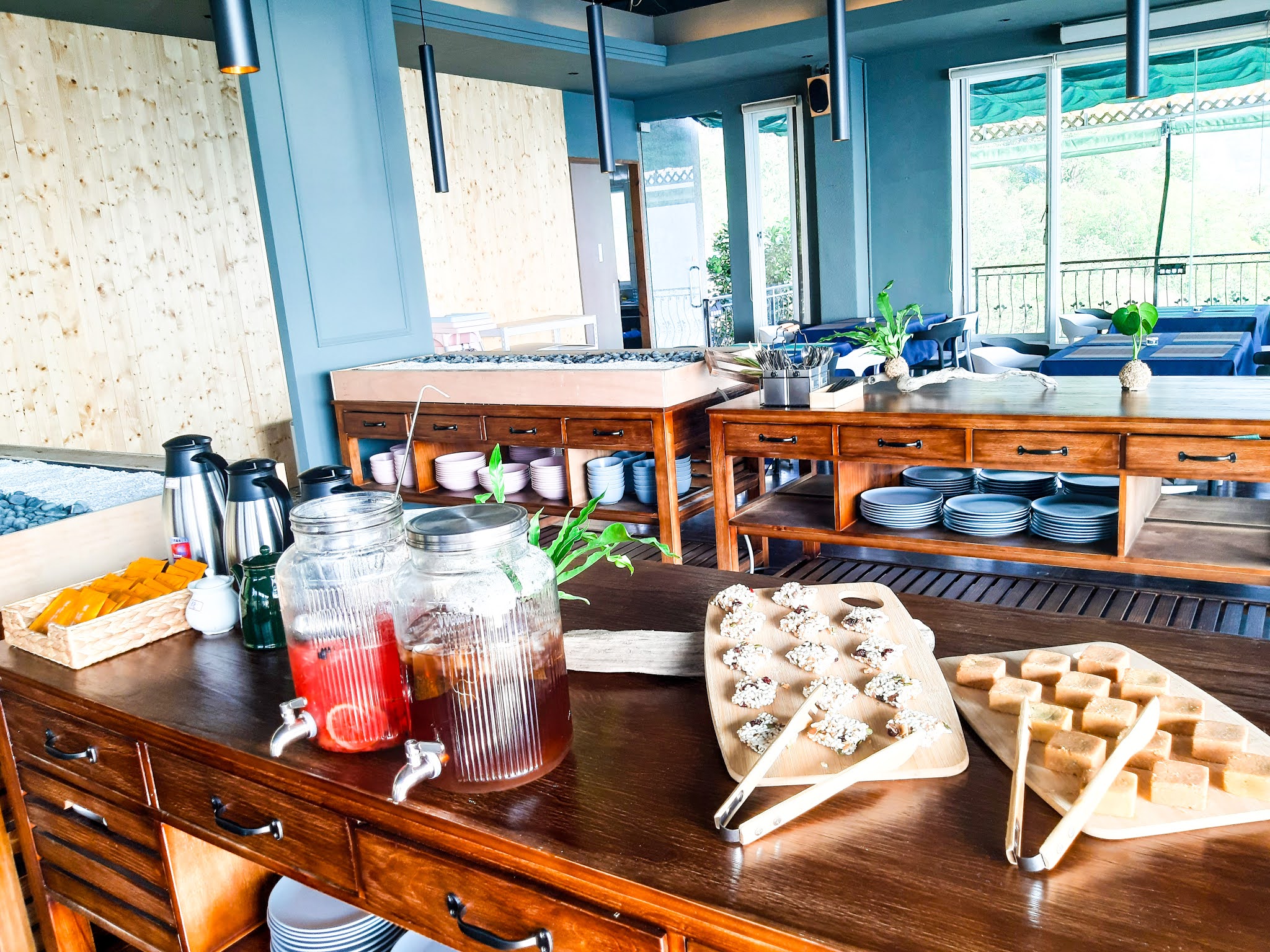 蟬說:山中靜靜︰早餐從8點開始,採Buffet方式有中式清粥小菜、飯糰、西式沙拉、麵包…等一樣很豐盛,最特別是可以自己捏製古早味飯糰,還有好可愛的貓咪生吐司!