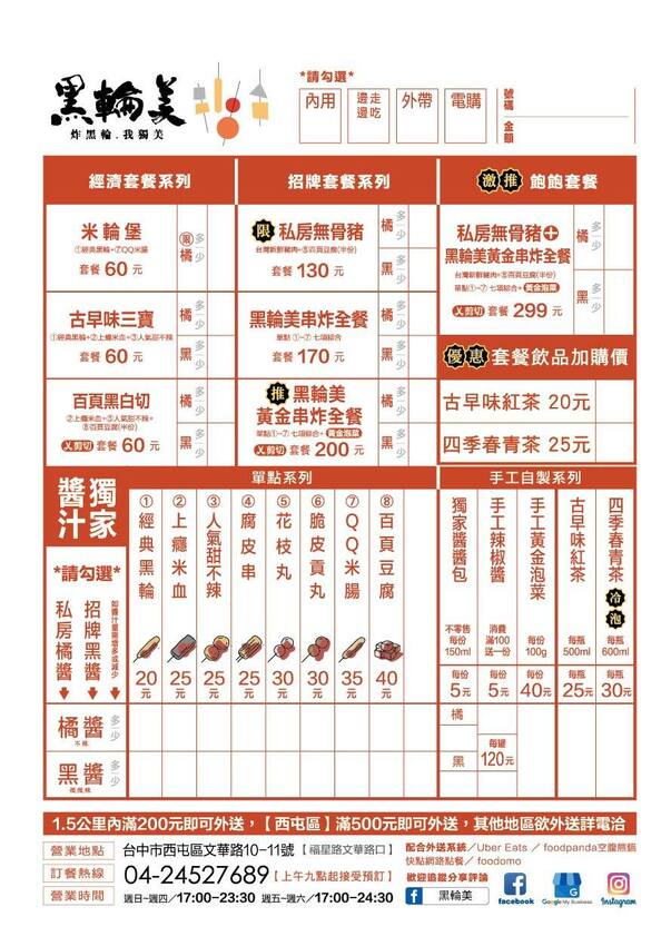 臉書粉絲頁按讚評論就送25元品項任選一串,逢甲周邊滿200元、西屯區滿500元可外送,也有配合Uber Eats及Foodpanda熊貓外送平台。