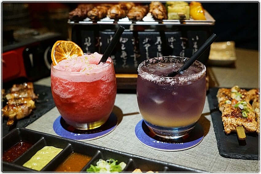 香橙梅果冰沙(左),以柳橙、莓果茶、可爾必思交融出酸甜酸甜的滑順滋味,搭上串燒相當解膩。獨角獸(右),以蝶豆花、柳橙、綠茶等變化出漸層的視覺效果,加上杯子邊緣有著一圈跳跳糖,喝前記得先攪拌均勻,喝起來也是很清爽微酸甜加上跳跳糖帶來的舌尖上的沁動,這一款可說是視覺與味覺的雙饗宴呢,這兩款無酒精飲料都很推薦喔!!