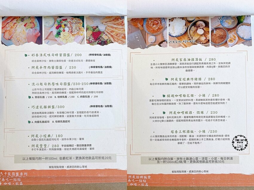 喜歡甜甜的就可以選擇法式吐司;小鳥胃的朋友很適合手作的肉醬圓盤;起司控可以選擇3種起司的熱壓吐司;巧達乳酪拼盤份量大,自作的巧達湯適合想吃飽飽的朋友,早午餐均附1杯500ml的伯爵紅茶,更換其他飲品可折抵20元;想吃飯食的朋友們,11點後供應,可以試試阿飛Brunch的咖哩,屬於印度辣,香料粉炒製成,麻油雞純酒香又帶點薑辣,都是招牌的菜色,飯食都會附上白飯、放牧土雞溏心蛋、涼菜、小菜、每日例湯、1杯500ml的紅茶/綠茶/青茶,更換其他飲品可折抵20元。