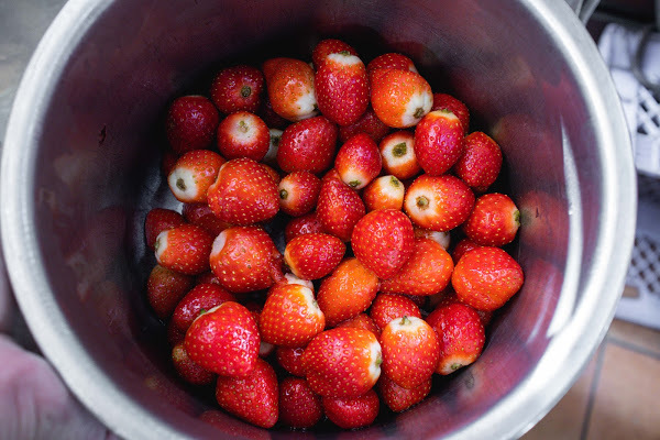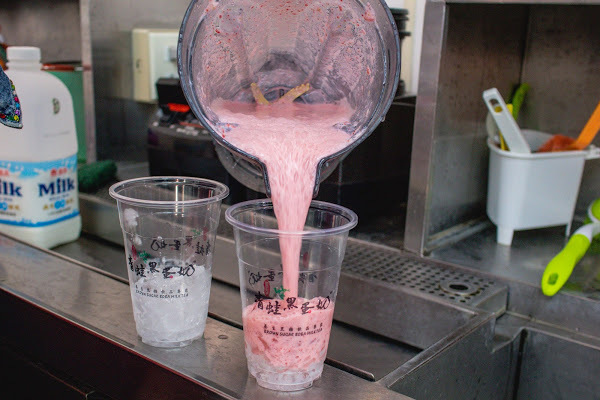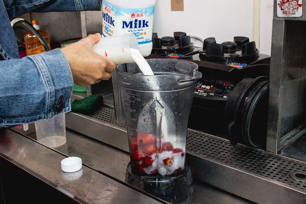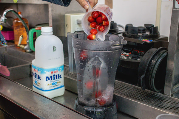 每日限量的草莓鮮奶買一送一超划算!數十顆拔好葉子清洗乾淨的草莓倒入果汁機,接著義美鮮奶加好加滿,不因活動買一送一而對食材有任何的打折。