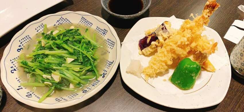 炸蝦天婦羅裡面有炸蝦、青椒、茄子、地瓜、芋頭,外層酥脆裡面還保有水分,滿好吃的。