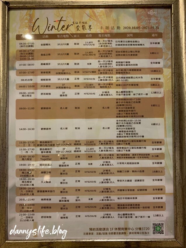 雲品溫泉酒店 的大廳也擺放了所有飯店的活動,讓遊客可以參加,不過有的活動需要報名~其中不乏許多親子活動,是一間闔家同住的飯店。