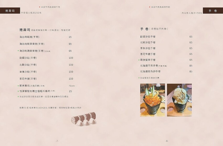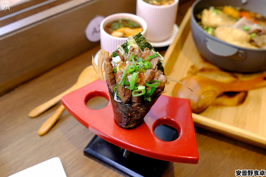 有意思的是手卷中有一道是蔥花牛腱手卷,醋飯搭配他們自己滷製的牛腱肉,再用海苔捲起來,淋上醬汁再撒點蔥花點綴。