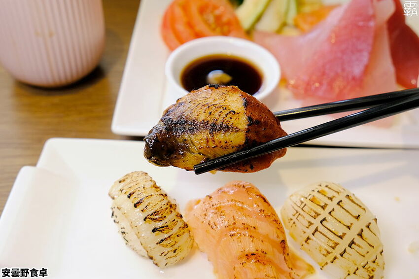 剛剛是生魚片鮭魚肚,現在炙燒鮭魚肚更顯得油光煥發,軟嫩的口感加上表面微微炙燒的香氣,配上微酸的醋飯吃好均衡好搭!