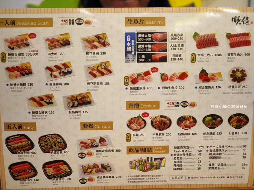 ↓順億的詳細菜單可以參考下方,分為壽司/生魚片/丼飯/甜點/捲物/熟食。