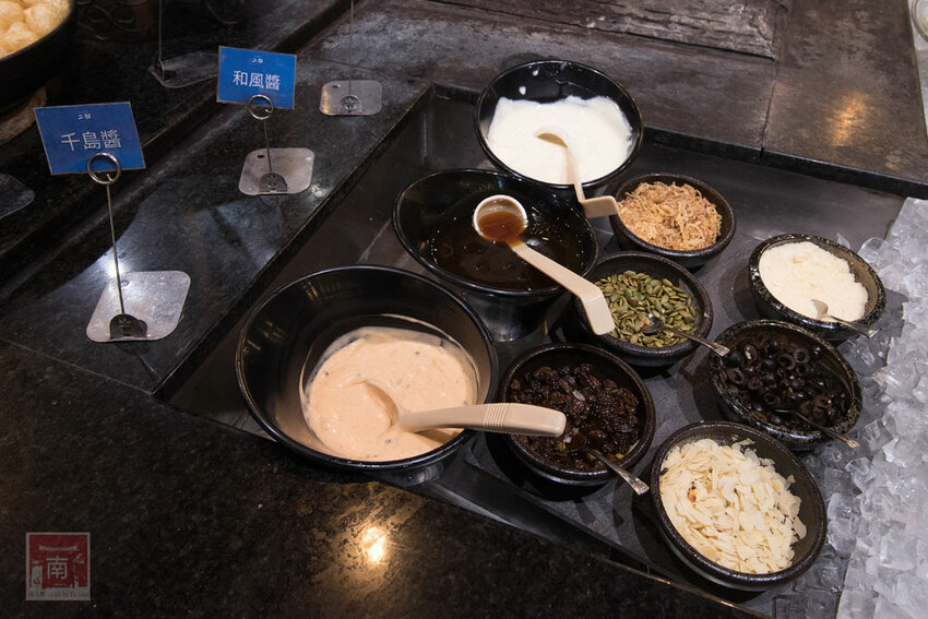 生菜沙拉區的生菜看起來就很清脆,不會看起來黑黑臭臭的,有三種醬汁,還有葵瓜子、橄欖、葡萄乾等做搭配,個人最喜歡寒天脆藻,是從昆布萃取物,口感清脆。