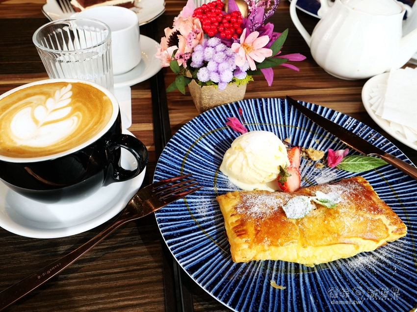 切開可頌般的酥皮內部是軟嫩的微酸甜蘋果內餡,搭配上香草冰淇淋是味蕾雙重奏。