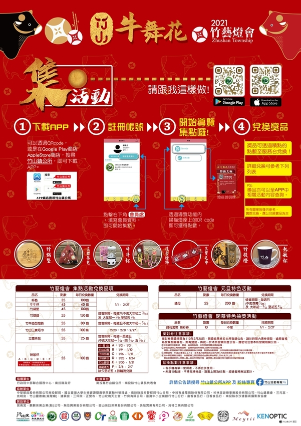 來竹山遊燈會,記得先下載竹山鎮公所的APP,就可以掃描燈藝作品旁的QRcode累積點數換紀念品。除了集點換贈品之外,每十點還可以換一張錢母套幣摸彩券,在2021/02/28閉幕那天,就有機會可以抽到紫南宮的錢母套幣喔!
