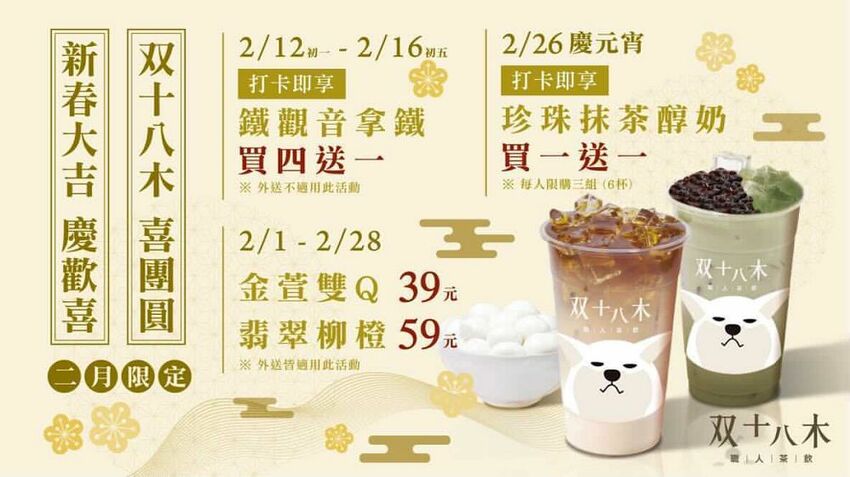 2月12日(初一)~2月16日(初五):打卡享 鐵觀音拿鐵 買四送一(不適用外送)