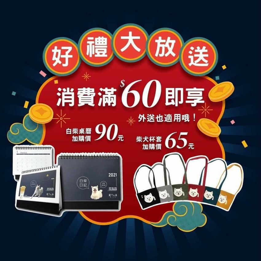 消費滿60元,還能優惠價購買白柴桌曆(+$90) ;或 限量柴犬環保杯套(+$65)。