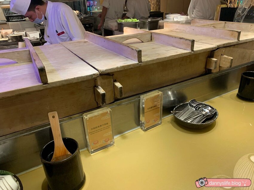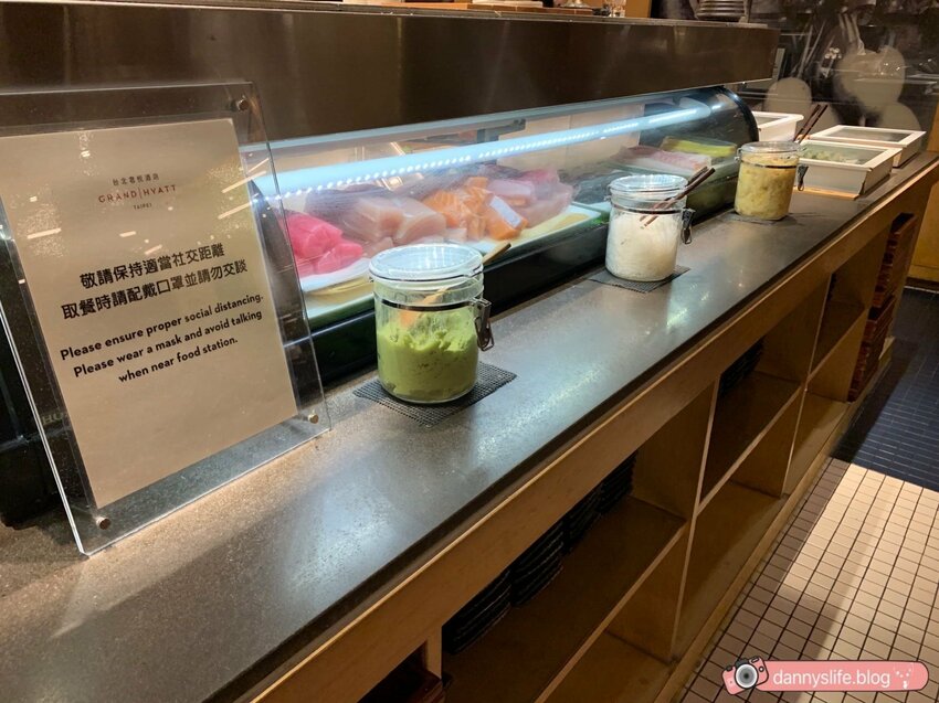 一旁擺放芥末、蘿蔔絲和薑片……等做搭配