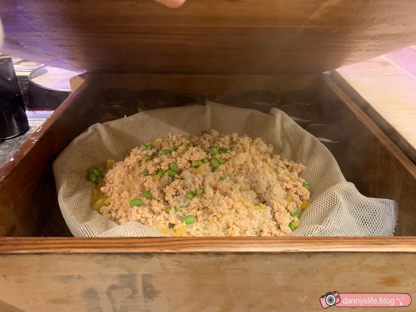 三個大蒸籠,分別有海鮮、鮭魚栗子蒸飯和松葉蟹茶碗蒸。