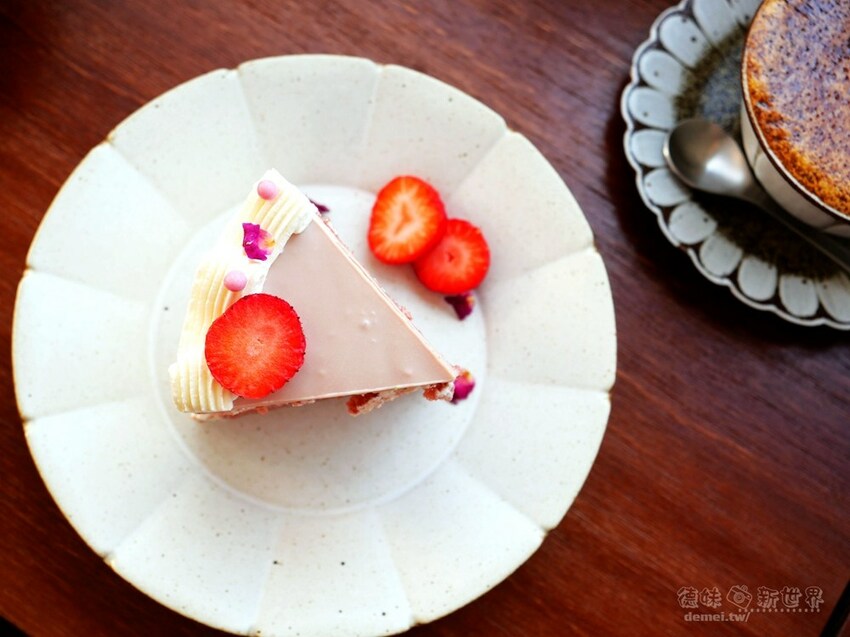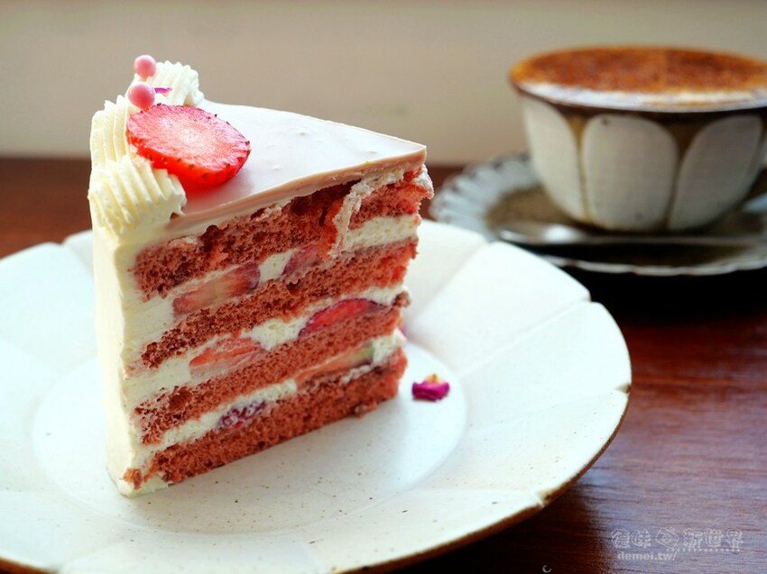草莓味的柔嫩蛋糕體間夾雜著新鮮草莓切片與滑順鮮奶油,玫瑰花瓣為裝飾。