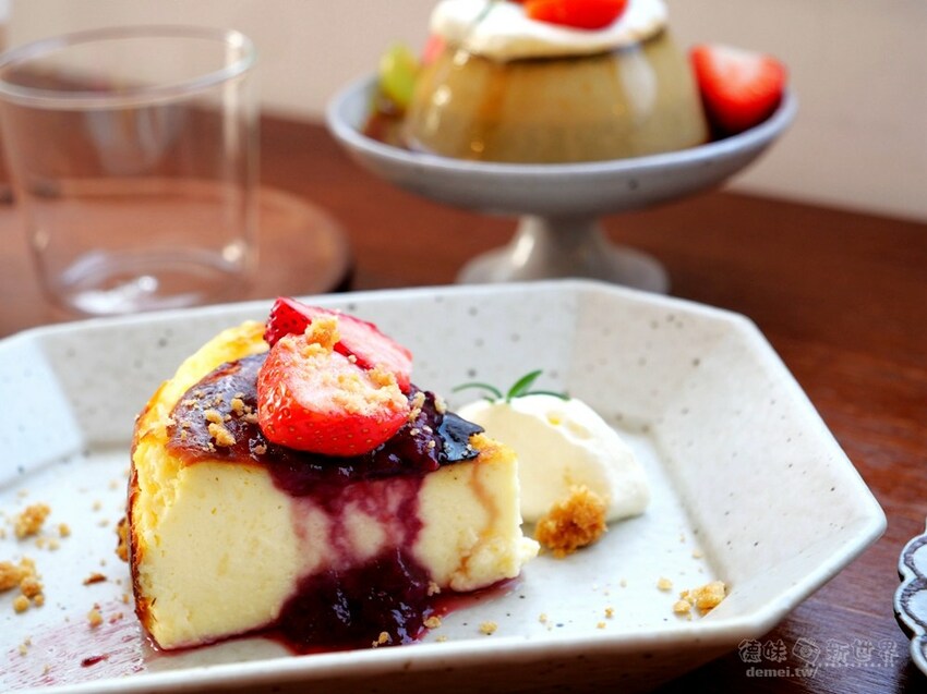 外表皮金黃微焦,內餡則是偏向扎實布丁的柔順細緻,搭配上自製莓果醬增添酸甜。