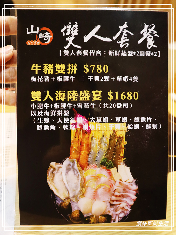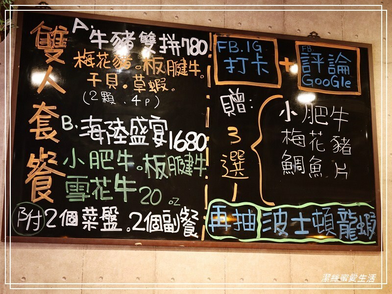 除了單人鍋物,也有雙人套餐能選擇,目前的優惠活動,FB打卡評論即贈三種肉盤擇一,還能再抽波士頓龍蝦呢!!