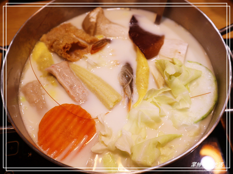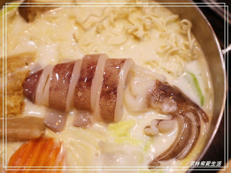 大草蝦肉質Q彈,軟絲也是海味鮮濃有嚼勁,本來以為這種海鮮類應該搭配清爽湯頭,但把它們放入牛奶鍋裡煮也覺得很不錯呢,總之食材新鮮才是王道啊!