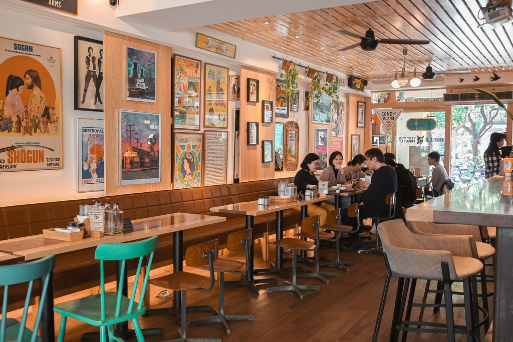 店內座位區分為吧檯區及沙發區,牆上掛著復古海報,整體呈現有點美式與英式混合餐酒館的風格。