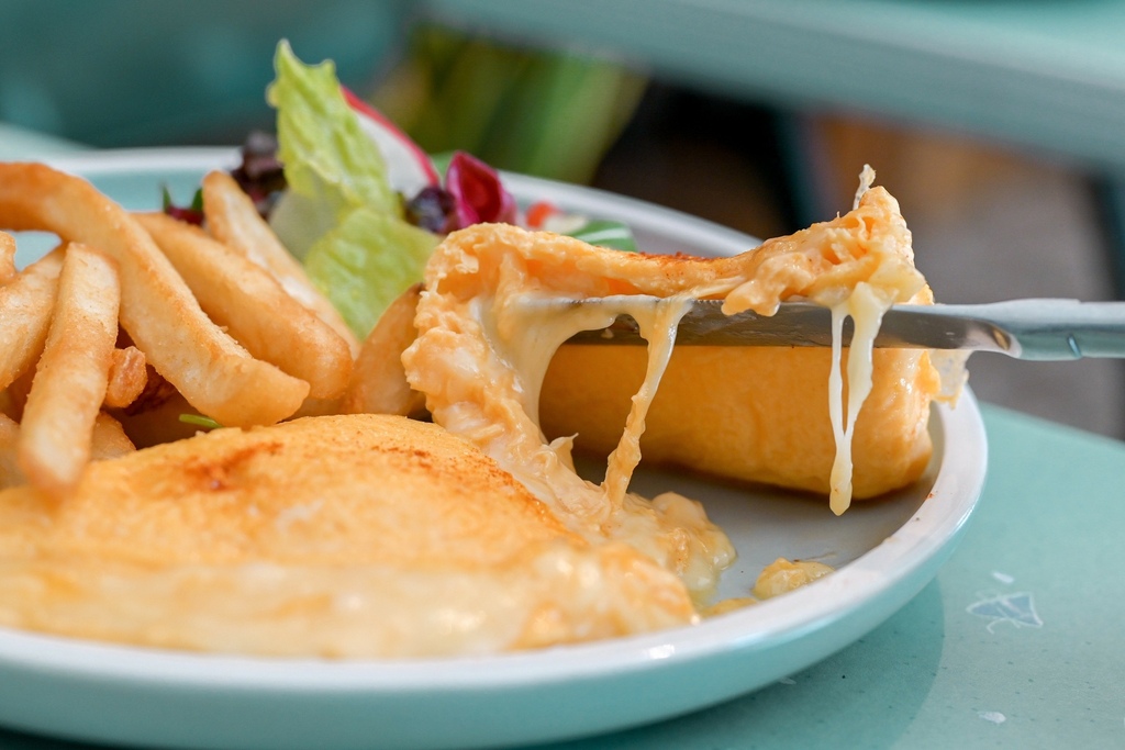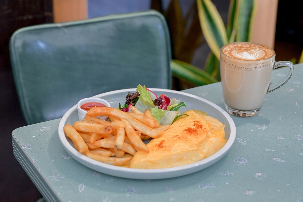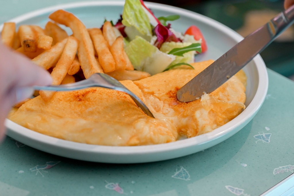 拼盤送上有主角切達起司歐姆蛋,沙拉與薯條。切開歐姆蛋裡有著大量起司,奶油味與起司味蠻重的,吃起來也比較單一就是起司、奶油及蛋的香氣,第一口還可以,但吃多了就變得很膩口,真心希望要是裡面再放些蔬菜會更好。