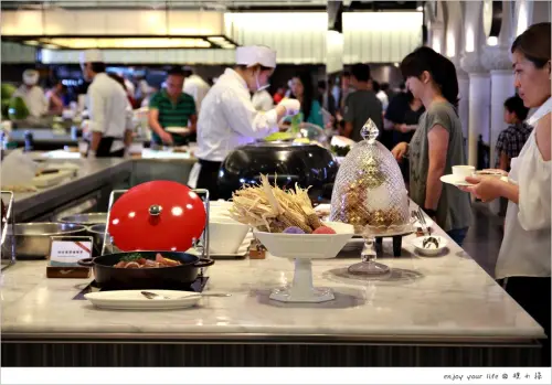 饗食天堂信義店的裝潢格局蠻有特色,將取餐區和座位區完全分割開來,好處是取食方便集中,用餐時也比較不會受干擾;壞處是取餐時要走比較多路,而且熱門菜色區的排隊人龍容易阻礙其他菜色的取餐動線。