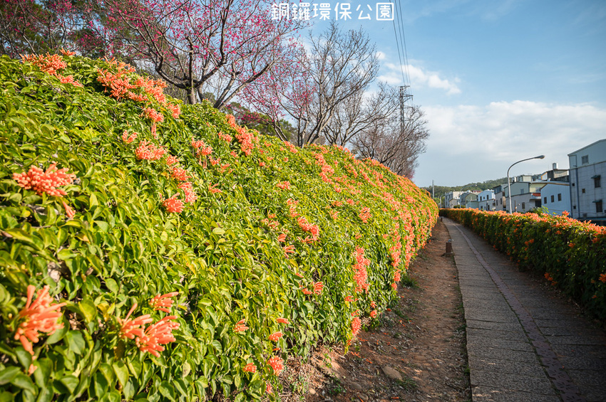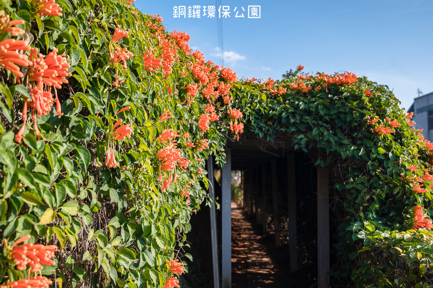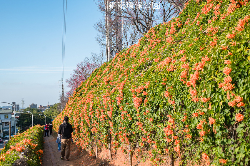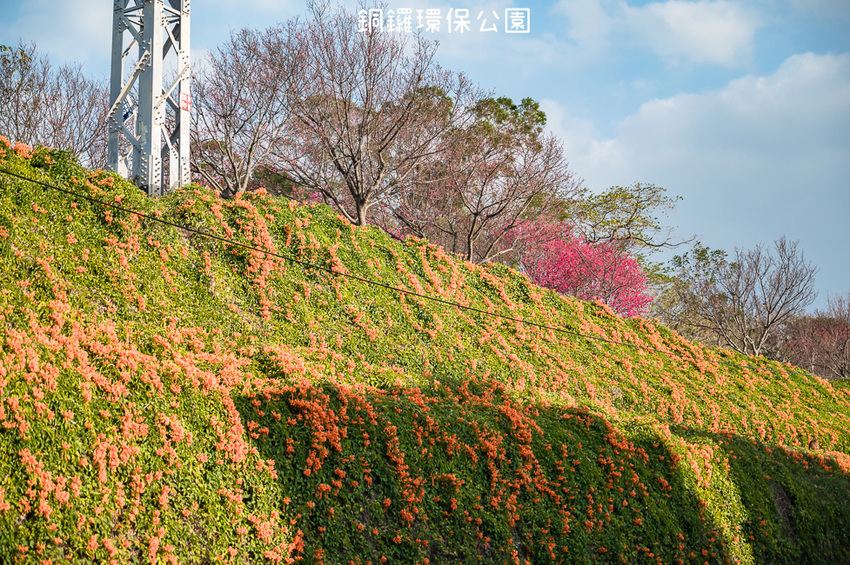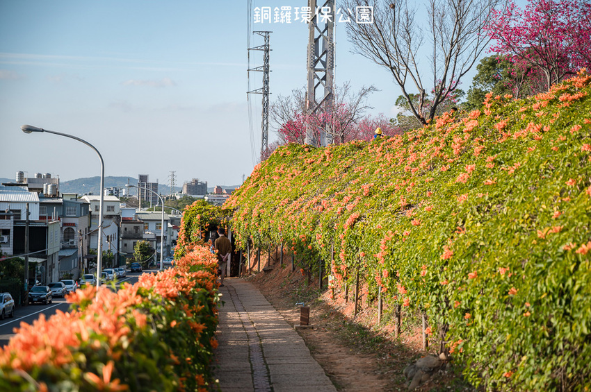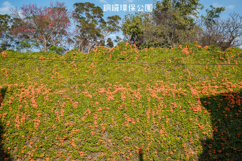 銅鑼環保公園的雙層炮仗花瀑布也是近幾年很夯的景點,在每年農曆年前後會開始綻放,而上面還有一個櫻花步道,來這邊一次可以看兩種花,這裡的炮仗花步道綿延了數百公尺,在炮仗花盛開的時候,整片橘色瀑布超美!