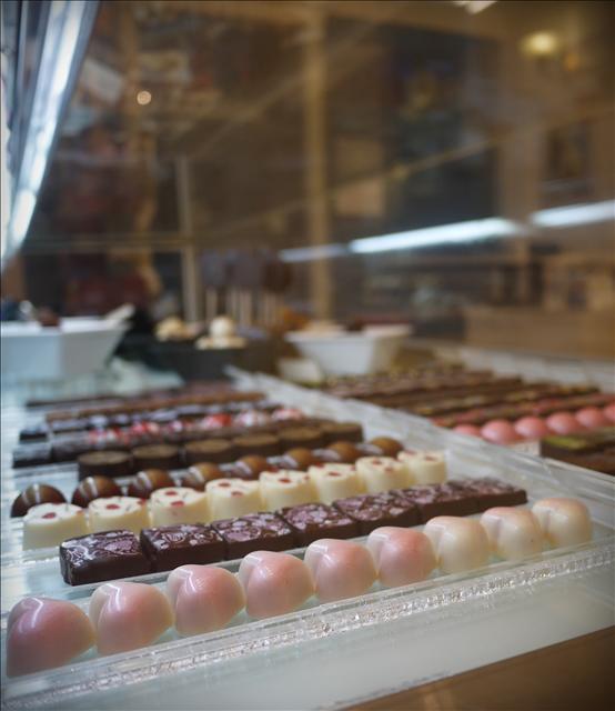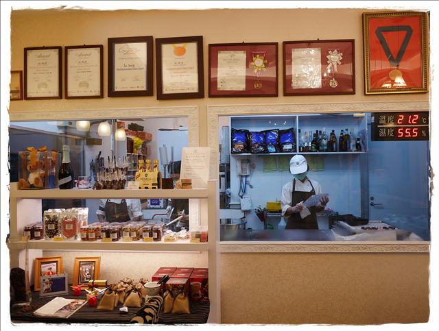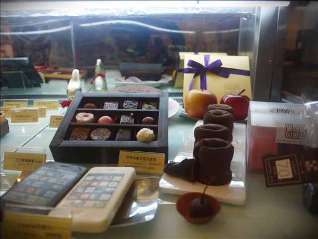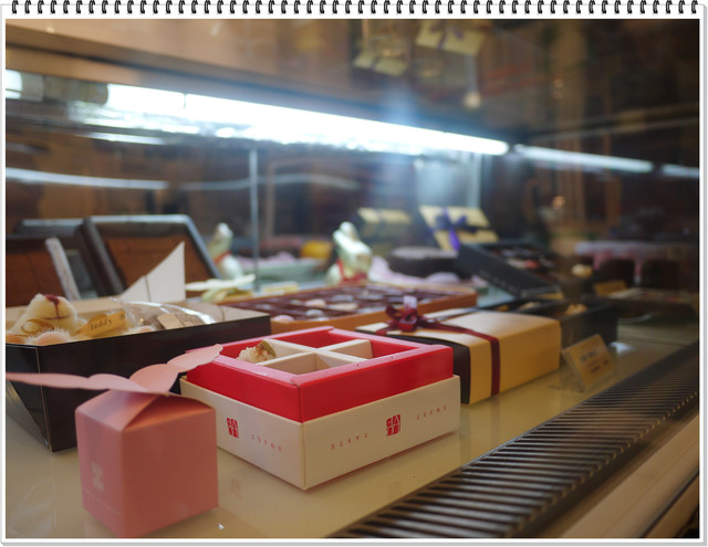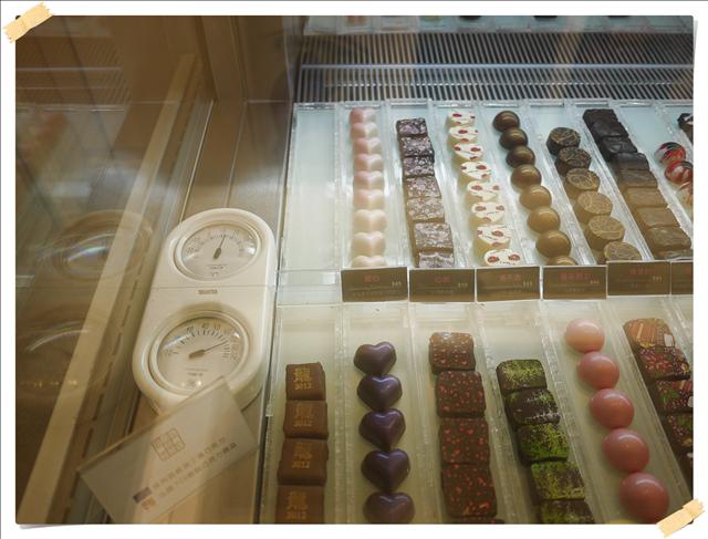 這是櫥櫃裡的巧克力 這裡的種類跟花樣更多 每一顆巧克力看起來就像是藝術品一樣