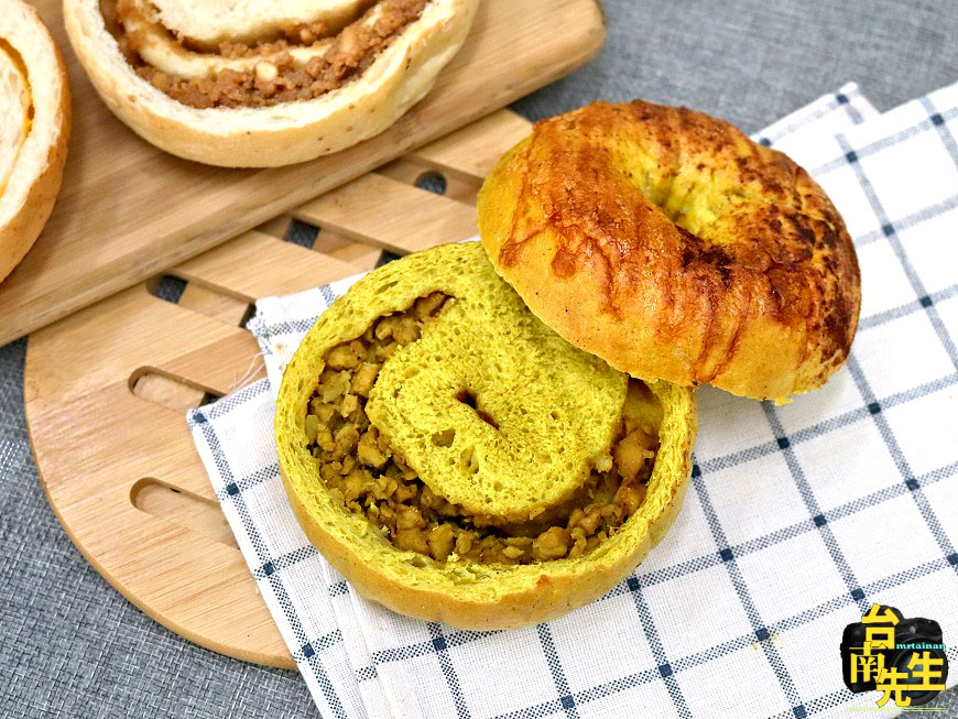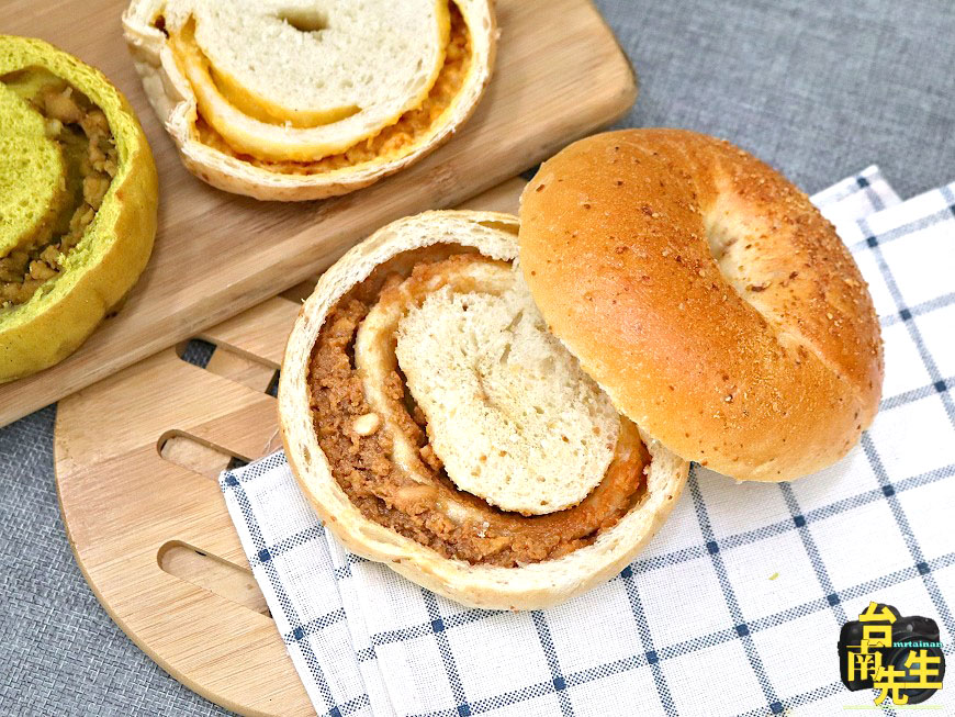 濃郁咖哩雞:把咖哩燉雞放進貝果裡,使用3種咖哩粉揉進麵糰中,一口咬下就能感受到香氣撲鼻的咖哩味,雞肉也非常鮮嫩完全不乾柴