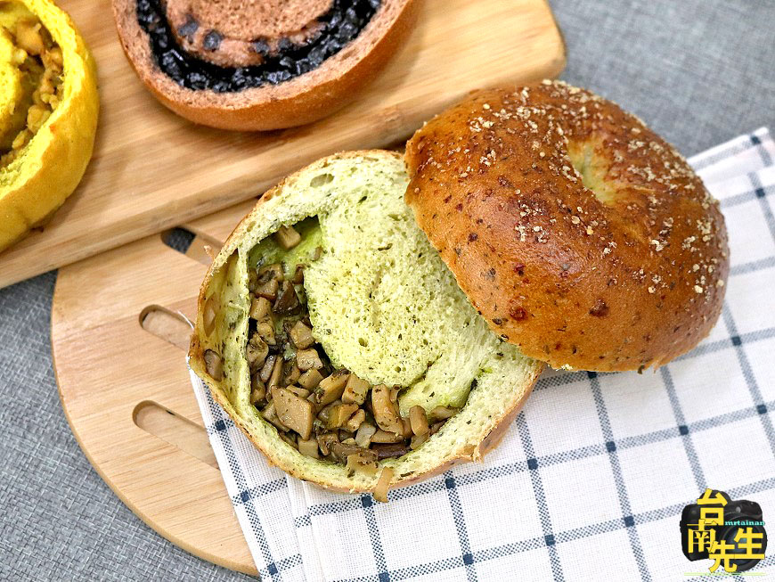 青醬野菇:自製羅勒松子青醬拌炒杏鮑菇,青醬鹹香夠味,杏鮑菇Q嫩爽口,是鹹口味貝果中的人氣NO1