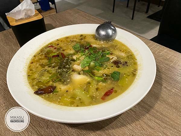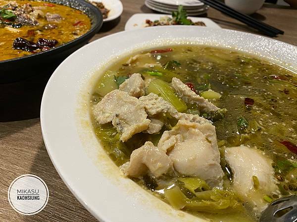 酸菜魚裡面是鱸魚塊,因為我本身不愛吃魚肉(尤其是帶皮的),所以我覺得魚肉還好,雖然好吃但我還是不愛,但是朋友們都覺得很推。