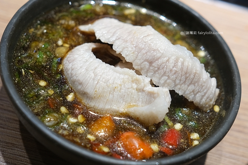 不少老饕都會很愛松阪豬肉,除了肉厚有咬勁之外,本身富含脆度,其實我覺得這個就連單吃也很不錯,當然沾上醬汁之後更有風味,如果是換成胡麻醬也很不賴呢!:)