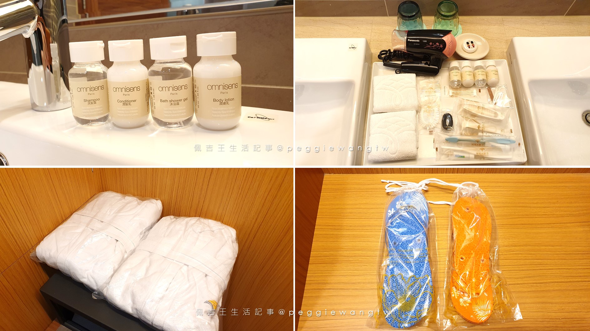 | 圖:福容備品包含自家品牌的洗潤髮乳/沐浴露/潤膚乳、牙刷&膏、髮圈/棉花棒/牙線/化妝棉/指甲刀/摺疊梳、拋棄浴帽、刮鬍刀&膏,還有浴袍,拖鞋是沙灘鞋呢~ |