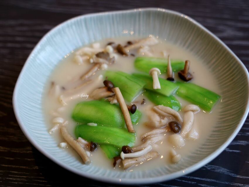 青雅中餐廳-濃雞湯野菌泡絲瓜,以濃厚乳白的雞湯為底,泡煮野菌及絲瓜,鮮甜的蔬菜吸附了滿滿雞湯的溫潤,我們把這道蔬菜湯,喝到一滴不剩。