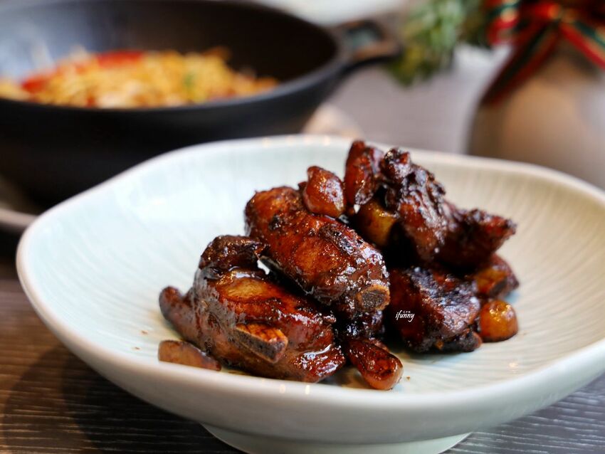 青雅中餐廳-金桔鎮江燒腩排,這道燒腩排味道燒得很棒,鹹中帶酸甜,令人吮指回味。一旁原以為是蒜瓣的,竟然是金桔,裹上了滿滿醬汁後,入口後有金桔原來的酸香,再加上醬香入味,味道及口感都令人驚喜。