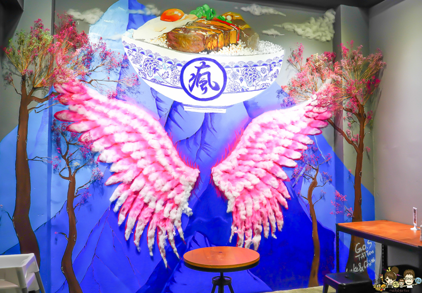 後方還隱藏一個超炫的網美牆,粉嫩的立體翅膀、超大碗的滷肉丼飯