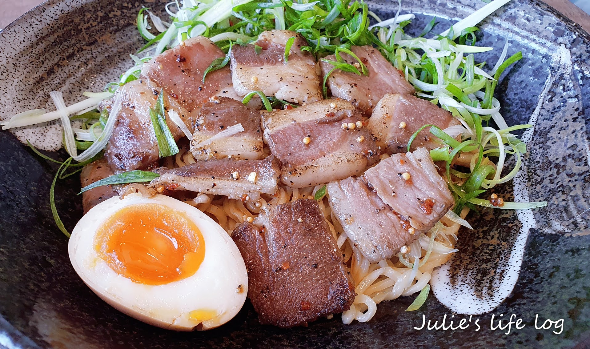賣相也十分好看,淺黃色麵體,排上一層炙燒肉,最上層是大把蔥絲,還有圓潤的溏心蛋,色香味俱全就是在說它吧!