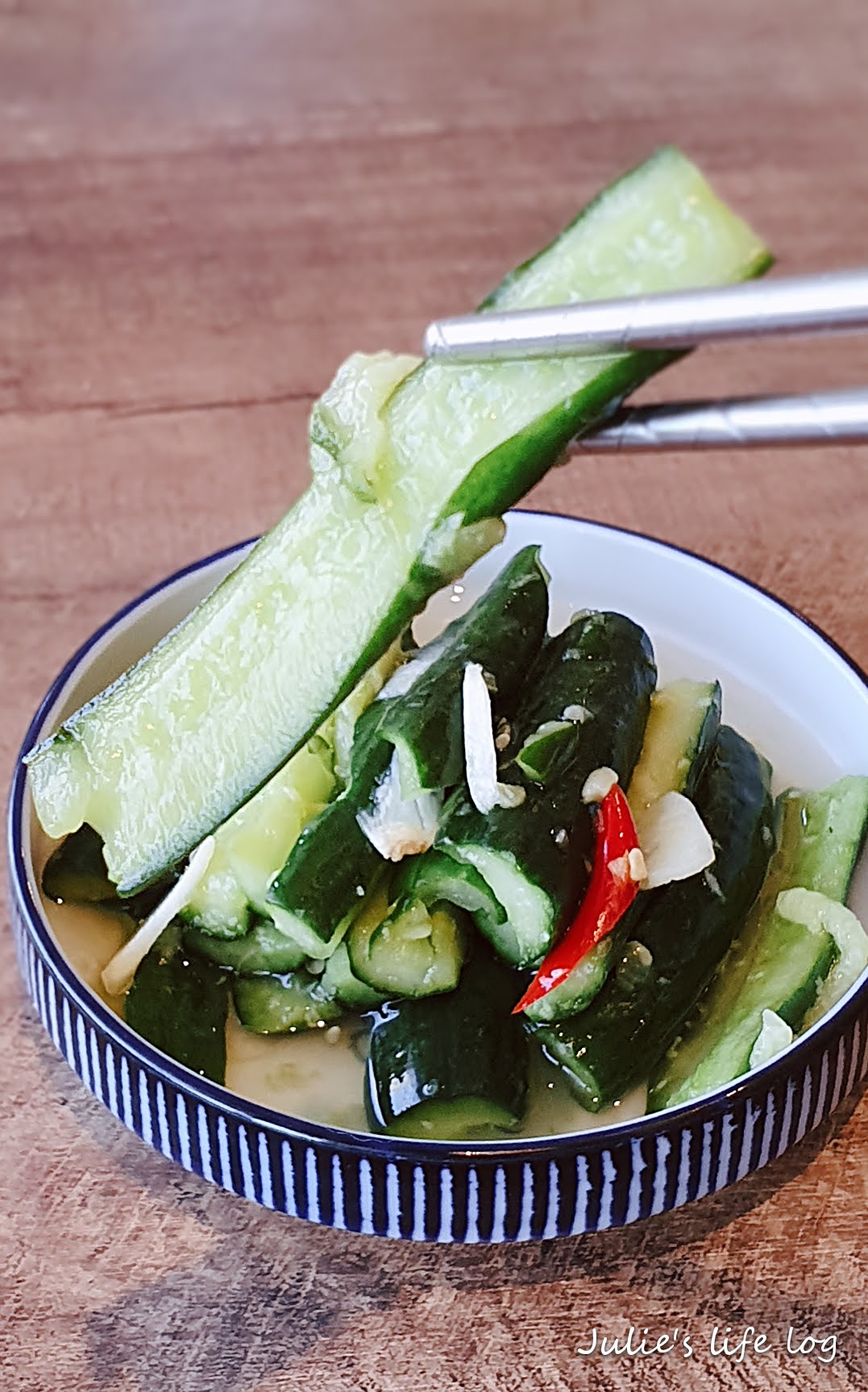 涼拌小黃瓜是我很喜歡的開胃小菜,酸酸脆脆的口感很清爽,拌上一些蒜末提味,辣椒應該是最後才放上去點綴顏色,沒什麼辣味。