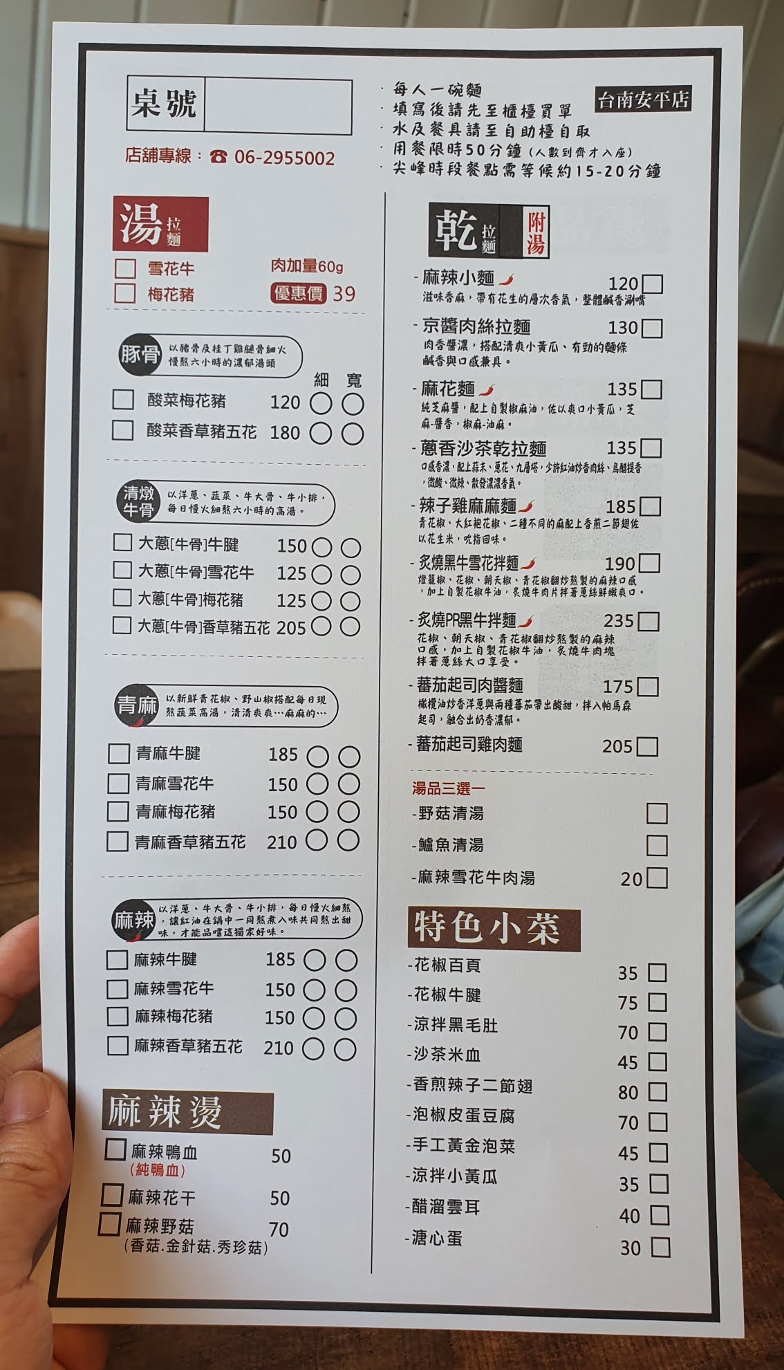 - 湯麵:四種湯頭,豚骨、清燉牛骨、青麻、麻辣