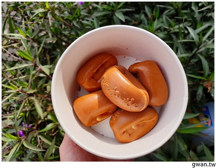 一份有五顆雞蛋糕,最後機器夾出來讓蛋糕兩側有點凹陷,沒有那種膨膨的圓潤感,但這是脆皮雞蛋糕呦,吃起來倒是很不錯,比我家旁邊有人在顧那種一包50元的雞蛋糕好吃XDD