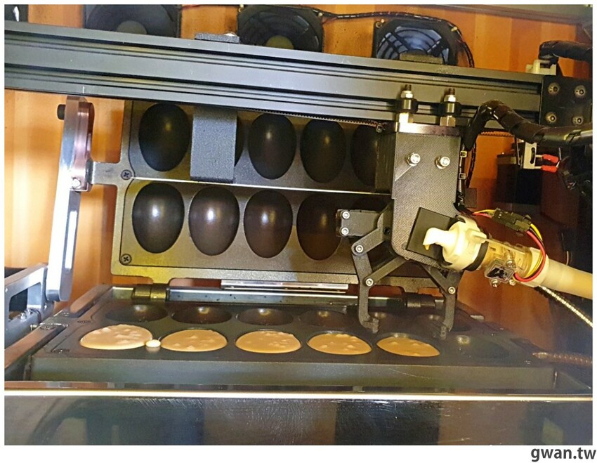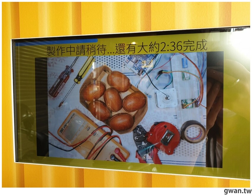 投幣後就可以從視窗看到機器手臂灌注麵糊的動作,看起來很療癒!而且居然不需要有人看顧爐火,讓我們讚嘆科技未免也太進步了~