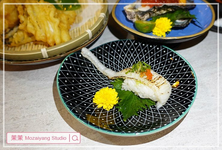 這道可厲害了,一整條的鰻魚捲上醋飯、佐以份量十足的海膽,鰻魚及海膽都夠新鮮,擺盤也漂亮,以握壽司來說,完全不是一口可以吃下的份量,很滿足的一品。